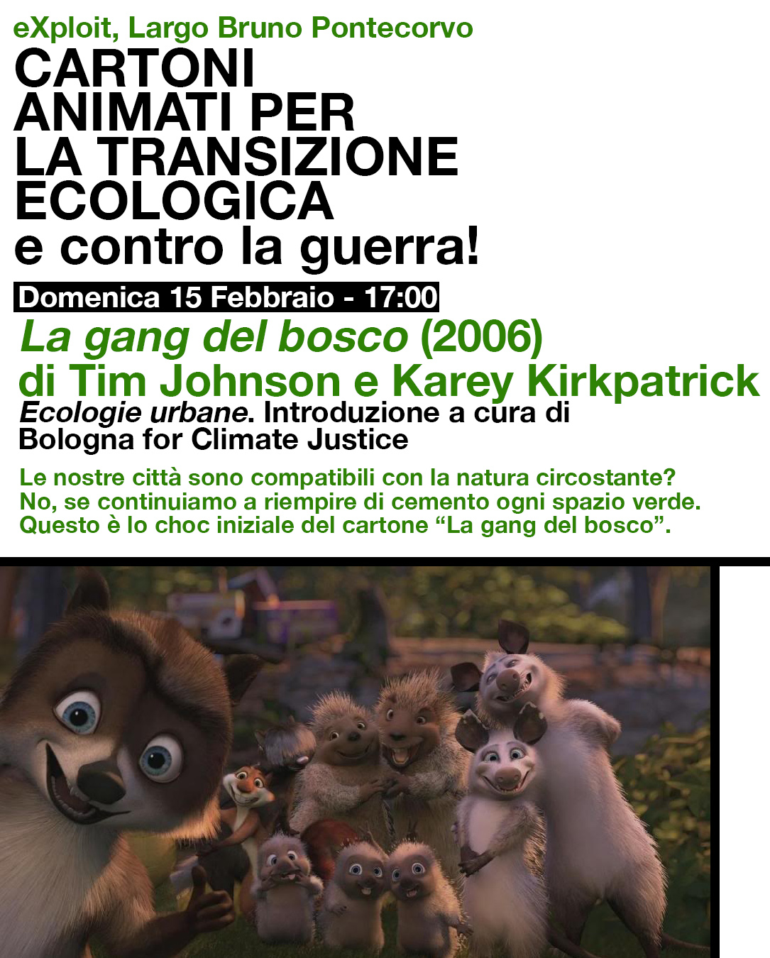 Il film ha, insomma, un finale positivo perché i principali antagonisti umani, e così anche l’orso, vengono sconfitti. Ma non si può dire che lo stesso accada con il modello di sviluppo e consumo di suolo, che priva gli animali del loro bosco. Sta a noi, allora, immaginare e costruire città coesistenti con la natura, libere dalla speculazione immobiliare e da ogni forma di sfruttamento. Per questo a introdurre questo film ci saranno lə compagnə di Bologna for climate justice, che approfondiranno il tema delle ecologie urbane.